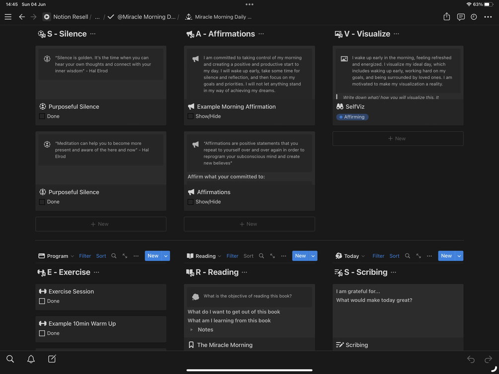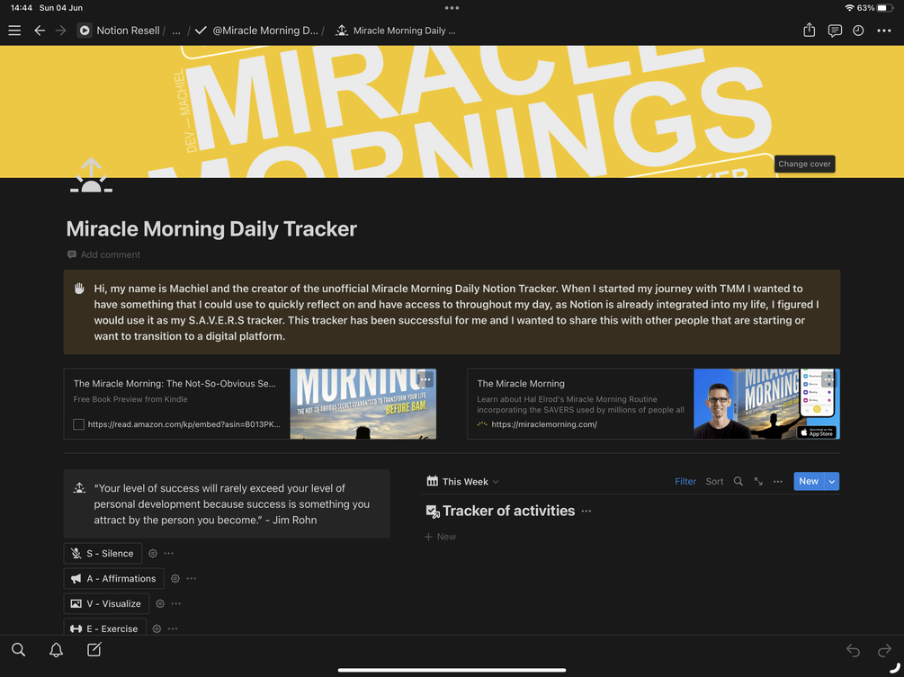 I've been inspired by the Miracle Morning book by Hal Elrod and implemented this in my life. I was so inspired, I built this Notion Tracker to keep me focused and give me access to my Miracle Morning activities where ever I go.